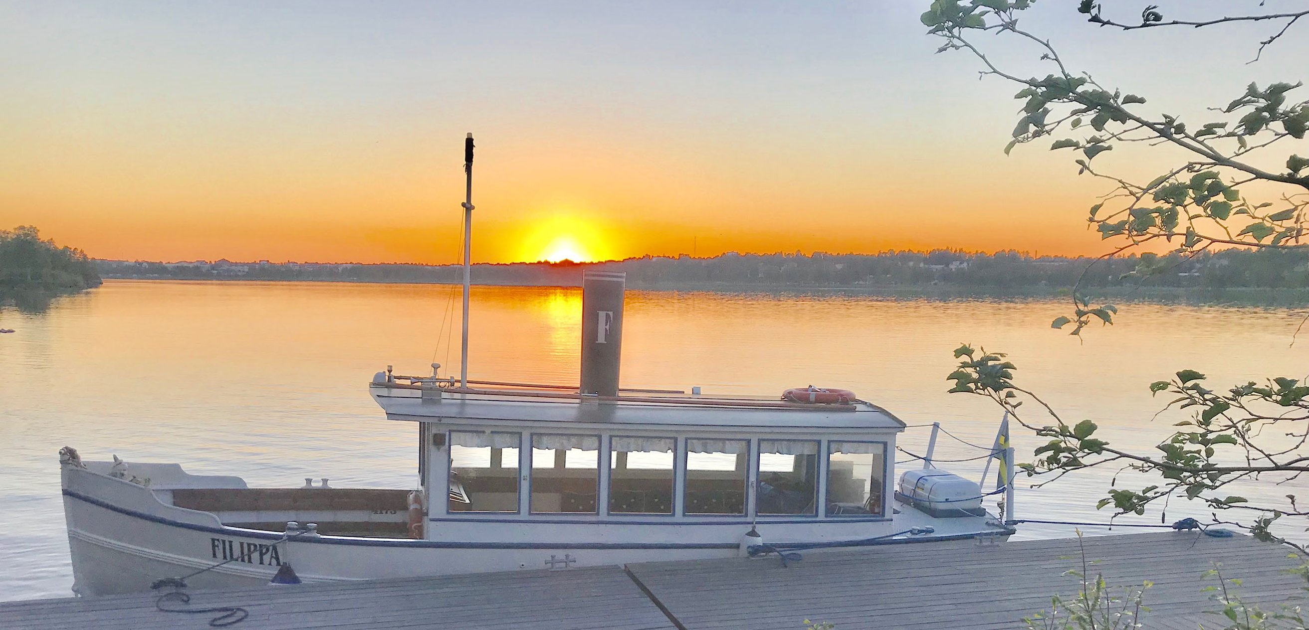 Vackert hamnområde med mindre badstrand, underbar kvällssol