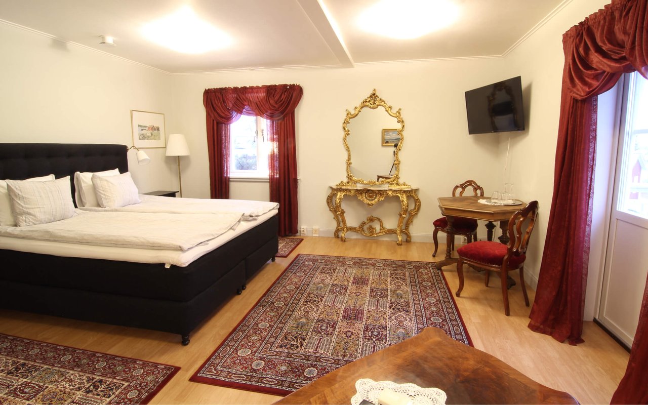 Our largest room, overlooking the Kalix river. A spacious suite of about 35 square meters. Often booked as a bridal suite. Private balcony overlooking the Kalix river. Bathroom with double showers. One or two extra beds can be booked. Breakfast included. Access to a shared kitchen.